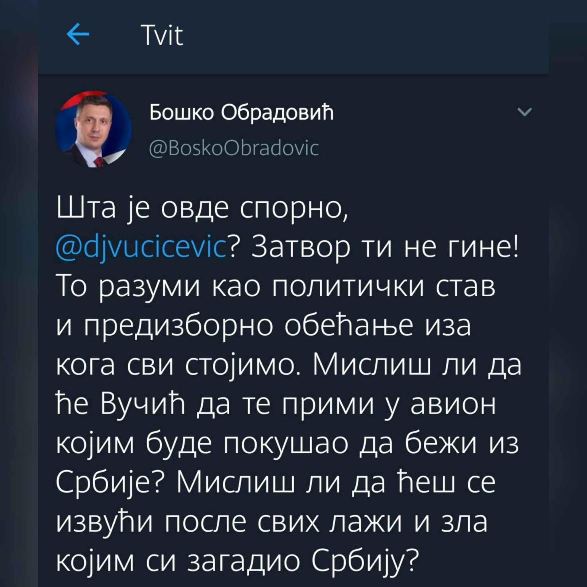 -Zatvor ti ne gine. To razumi kao politički stav i predizborno obećanje iza koga svi stojimo. Misliš li da će Vučić da te primi u avion kojim bude pokušao da beži iz Srbije? – bio je oštar Obradović na Tviteru.