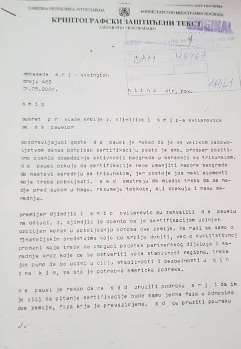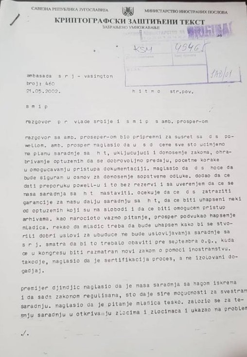 Uz papir koji je sastavio sam Đinđić, objavljujemo i detaljne izveštaje sa sastanaka koje su Đinđić i Goran Svilanović imali u Vašingtonu u maju 2002. sa državnim sekretarom Kolinom Pauelom i američkim ambasadorom koji se bavio pitanjem ratnih zločina Pjerom Rišarom Prosperom. Manje od godinu dana nakon toga Đinđić je ubijen. Izveštaje je u Beograd slao tadašnji otpravnik poslova u našoj ambasadi (ambasadora nismo imali) Ivan Živković.