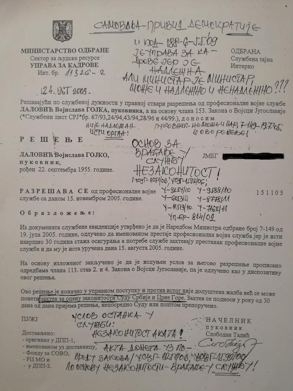 S obzirom na zakonsku činjenicu da je ostanak u službi pukovnika Gojka Lalovića zavisio od zakonitosti naredbodavnih akata, a navedenim odlukama naredbodavna akta oglašena nezakonitim, ispunjeni su uslovi za ostanak u službi. Međutim, u ponovnom postupku po službenoj dužnosti u izvršenju presuda Vrhovnog suda Srbije ministar vojni (tada Šutanovac) za razliku od prethodnih donosi SAM oba naredbodavna akta (i rešenje i naredbu) ponavljajući poništeni datum o razrešenju 15.11.2005. godine, što je suprotno zakonu (novi akt mora nositi datum donošenja novog akta) i pravnim shvatanjima i primedbama suda obavezujućih u navedenim presudama.